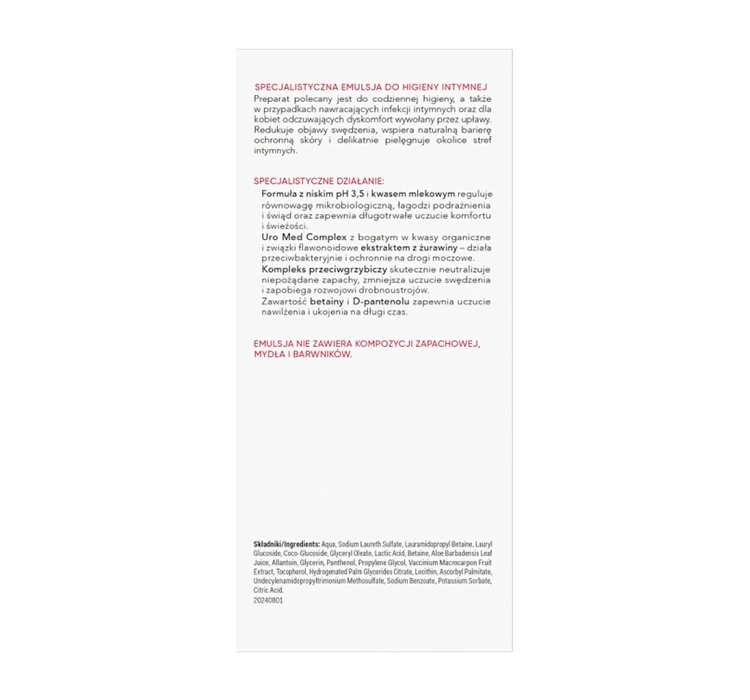Dank ihrer sorgfältig ausgewählten Wirkstoffe bietet die Emulsion eine angemessene Pflege. Die Formel mit einem niedrigen pH-Wert von 3,5 hilft, das natürliche saure Milieu der Intimzone wiederherzustellen, wodurch das Risiko wiederkehrender Infektionen im Intimbereich verringert wird
