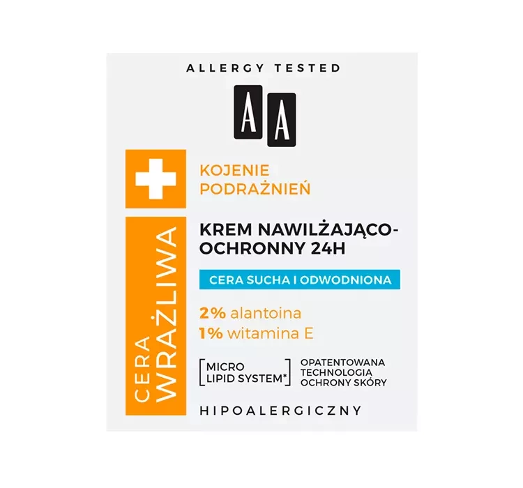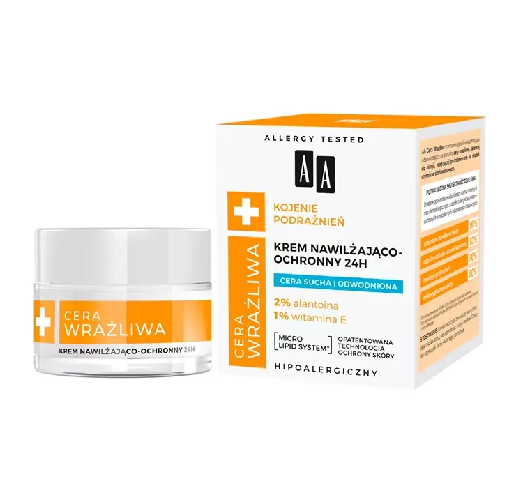 Die feuchtigkeitsspendende und schützende 24h-Creme aus der Serie AA Sensitive Skin hat eine hypoallergene, dermatologisch getestete Formel, angepasst an die Bedürfnisse sensibler und zu Allergien neigender Haut. Die Kosmetik enthält keine Duftstoffe, Parabene oder Farbstoffe. Sie hat einen neutralen pH-Wert für die Haut.