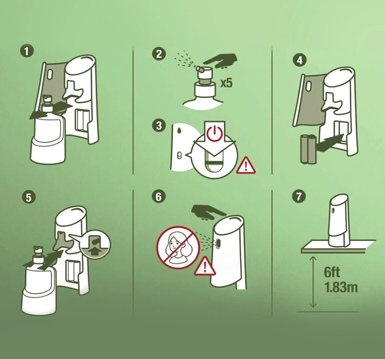 Positionierung: Es wird empfohlen, den Lufterfrischer in einer Höhe von mindestens 180 cm über dem Boden zu platzieren – fern von direktem Kontakt mit Gesicht, Lebensmitteln oder Textilien.