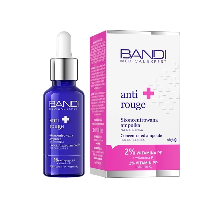 Konzentrierte Ampulle für Couperose aus der Bandi Medical Anti Rouge Linie beruhigt Irritationen und stellt gleichzeitig eine makellose Hautstruktur wieder her. Die Formel des Präparats wurde angereichert mit Vitamin B3 (Niacinamid), Vitamin K2 und Kudzu-Wurzelextrakt. Vitamin B3 reduziert Entzündungen, gleicht den Teint aus, unterstützt die Regeneration der Haut und schützt vor Austrocknung. Vitamin K2 glättet die Haut und verringert Rötungen. Kudzu-Wurzelextrakt neutralisiert freie Radikale und beruhigt irritierte Haut.