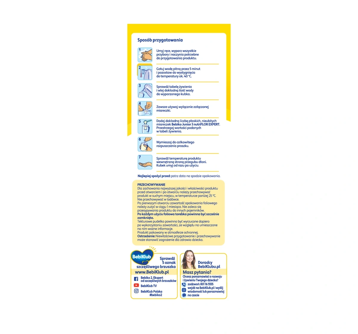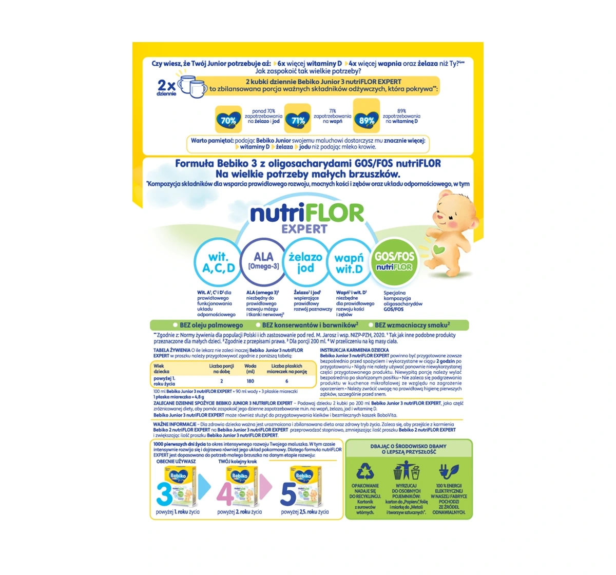 • Für die Gesundheit deines Kindes sind eine ausgewogene Ernährung und ein gesunder Lebensstil entscheidend. Der Wechsel von Bebiko 2 NUTRIflor Expert zu Bebiko Junior 3 NUTRIflor Expert sollte schrittweise erfolgen, indem die Menge der vorherigen Milch reduziert und die Menge der neuen erhöht wird.