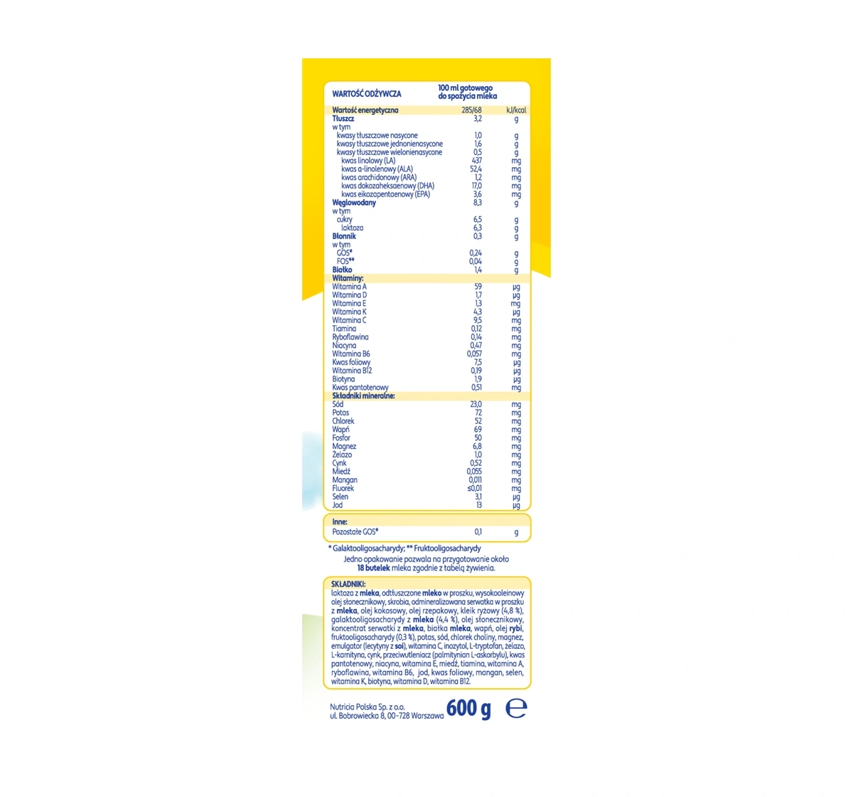 Zutaten: Laktose aus Milch, Magermilchpulver, hocholeinsäurereiches Sonnenblumenöl, Stärke, demineralisiertes Molkenpulver aus Milch, Kokosöl, Rapsöl, Reisbrei (4,8 %), Galaktooligosaccharide aus Milch (4,4 %), Sonnenblumenöl, Molkenkonzentrat aus Milch, Milcheiweiß, Kalzium, Fischöl, Fruktooligosaccharide (0,3 %), Kalium, Natrium, Cholinchlorid, Magnesium, Emulgator (Sojalecithine), Vitamin C, Inositol, L-Tryptophan, Eisen, L-Carnitin, Zink, Antioxidationsmittel (Ascorbylpalmitat), Pantothensäure, Niacin, Vitamin E, Kupfer, Thiamin, Vitamin A, Riboflavin, Vitamin B6, Jod, Folsäure, Mangan, Selen, Vitamin K, Biotin, Vitamin D, Vitamin B12