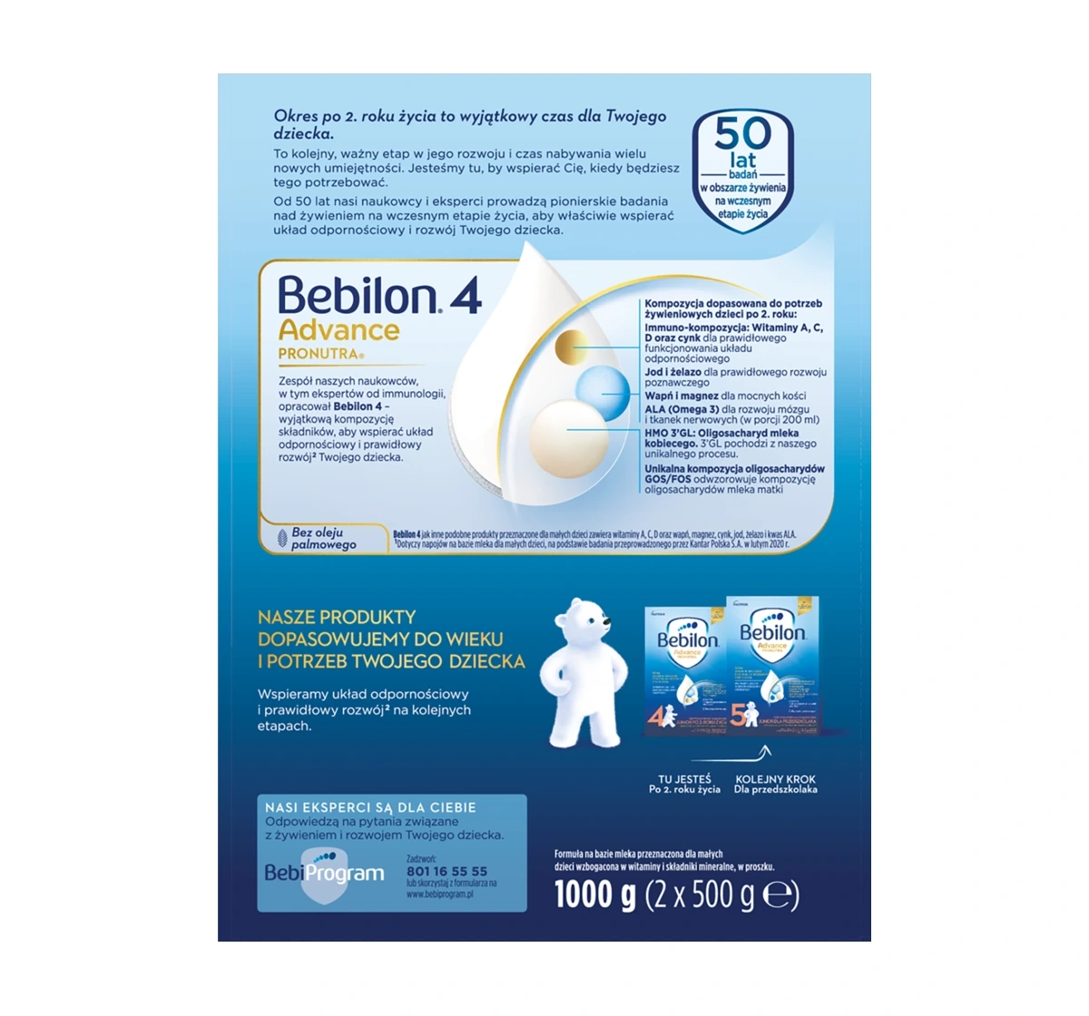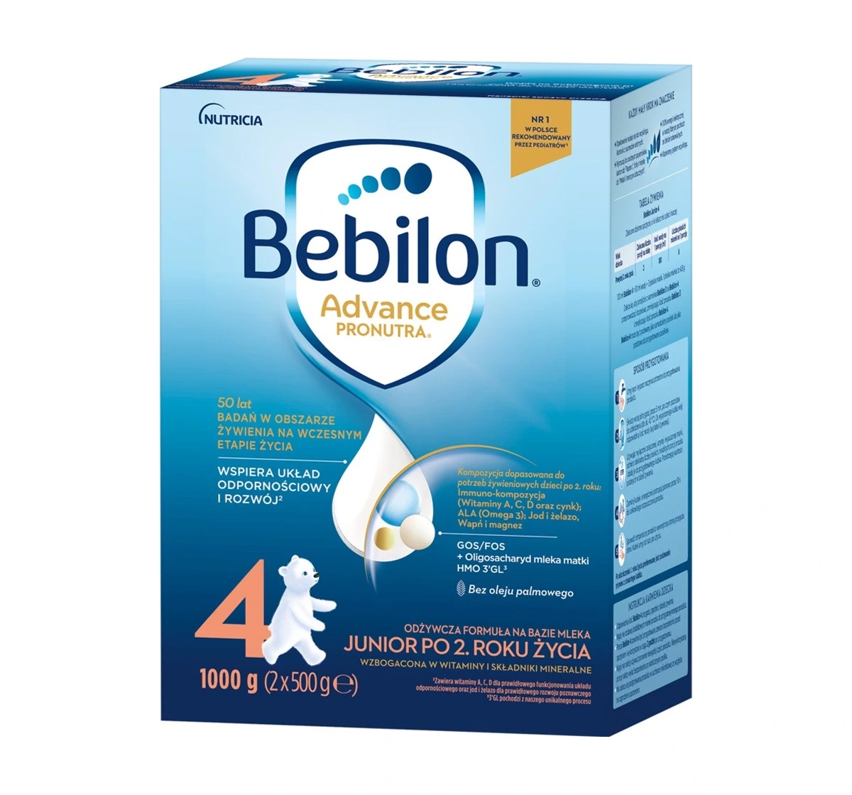 Die Zusammensetzung von Bebilon Advance Pronutra 4 ist mit wichtigen Nährstoffen wie Omega-3-Fettsäuren (DHA) angereichert, die die Entwicklung des Gehirns unterstützen, Prebiotika GOS/FOS für eine gesunde Darmflora sowie wichtige Vitamine und Mineralstoffe, darunter Kalzium und Vitamin D, die für starke Knochen und Zähne sorgen. Außerdem enthält die Formel Eisen, Magnesium und Zink, die das Immunsystem sowie die allgemeine körperliche und geistige Entwicklung fördern. Die sorgfältig ausgewählte Zusammensetzung der Inhaltsstoffe ist auf die sich dynamisch verändernden Bedürfnisse von Kindern in diesem Alter abgestimmt.