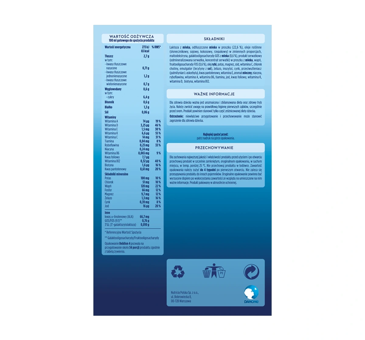 Inhaltsstoffe: Laktose aus Milch, entrahmtes Milchpulver (22,6%), Pflanzenöle (Sonnenblumen-, Soja-, Kokos- und Rapsöl) in variierenden Proportionen, Maltodextrin, Galaktooligosaccharide GOS aus Milch (8,6%), Molkenprodukt (entmineralisierte Molke, Molkenkonzentrat) in Pulverform aus Milch, Kalzium, Fruktooligosaccharide FOS (0,6%), Fischöl, Kalium, Magnesium, Natrium, Vitamin C, Cholinchlorid, Emulgator (Sojalecithine), Eisen, Inositol, Zink, Antioxidans (Ascorbylpalmitat), Pantothensäure, Vitamin E, Milcharoma, Niacin, Riboflavin, Vitamin A, Vitamin B6, Thiamin, Jod, Folsäure, Vitamin K, Vitamin D, Biotin, Vitamin B12.