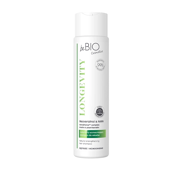 Die Kombination von Resveratrol und NMN ist für die antioxidative Wirkung verantwortlich und schützt die Kollagen- und Elastinfasern vor Zerstörung. Der in der Rezeptur enthaltene Komplex DensiForce™ ermöglicht es, dass alle Inhaltsstoffe tief in die Haarstruktur eindringen, wodurch das natürliche Shampoo BeBIO Longevity noch wirksamer wird. Das stärkende Shampoo BeBIO Longevity hat eine vegane Formel. Produkt nicht an Tieren getestet.