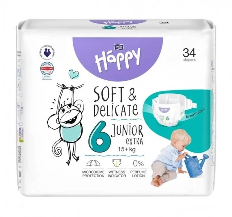 Die Windeln Bella Baby Happy Soft & Delicate für Kinder sind nicht nur sehr bequem, sondern auch besonders sanft zur Haut. Sie sind aus weichem Material gefertigt und passen sich dank elastischer Bündchen an den Seiten der Körperform des Kindes an, was hohen Komfort und Bewegungsfreiheit bietet. Das ist besonders wichtig für aktive Kinder, die Selbstständigkeit lernen.