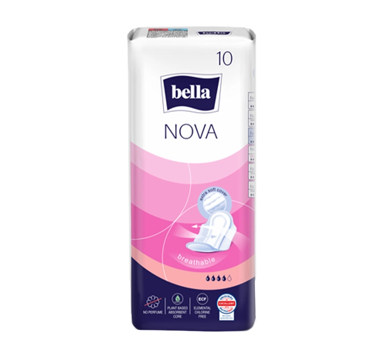 Bella Nova sind Binden in klassischer Dicke, die für Komfort und ein angenehmes Tragegefühl sorgen. Sie sind mit einem weichen, hautfreundlichen Vlies überzogen, das Reizungen vorbeugt. Die untere Schicht ermöglicht eine freie Luftzirkulation und hilft so, die Intimhygiene aufrechtzuerhalten. Zudem verfügen sie über Flügel, die für besseren Halt in der Unterwäsche sorgen, wodurch ein Verrutschen im Alltag verhindert wird. Sie enthalten kein elementares Chlor und sind daher ideal für empfindliche Haut geeignet.
