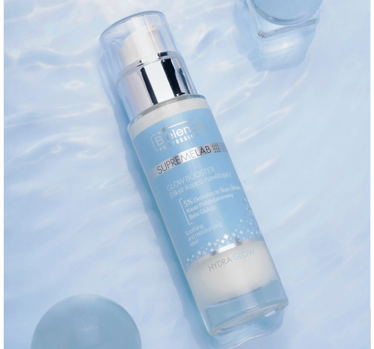 Das beruhigende und feuchtigkeitsspendende GLOW BOOSTER Gesichtselixier von Bielenda Professional Supremelab Hydra Glow hinterlässt ein angenehmes Gefühl der Hydratation und Glättung auf der Haut, dank der reichhaltigen Zusammensetzung voller aktiver Inhaltsstoffe. Verantwortlich für die wirksame Wirkung des Produkts sind: Schneckenschleimextrakt, Polyglutaminsäure, Beta-Glucan und Madecassoside. Dank dieser Inhaltsstoffe spendet das Produkt nicht nur tiefenwirksam Feuchtigkeit, sondern reduziert auch das Erscheinungsbild von Falten, verringert Rötungen und beruhigt empfindliche und gereizte Haut.