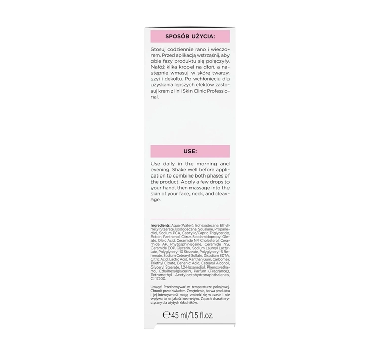 Täglich morgens und abends anwenden. Vor der Anwendung gut schütteln, damit sich beide Phasen vermischen. Einige Tropfen auf die Handfläche geben und anschließend in die Haut von Gesicht, Hals und Dekolleté einmassieren. Nach dem Einziehen für bessere Ergebnisse eine Creme aus der Skin Clinic Professional Linie verwenden.