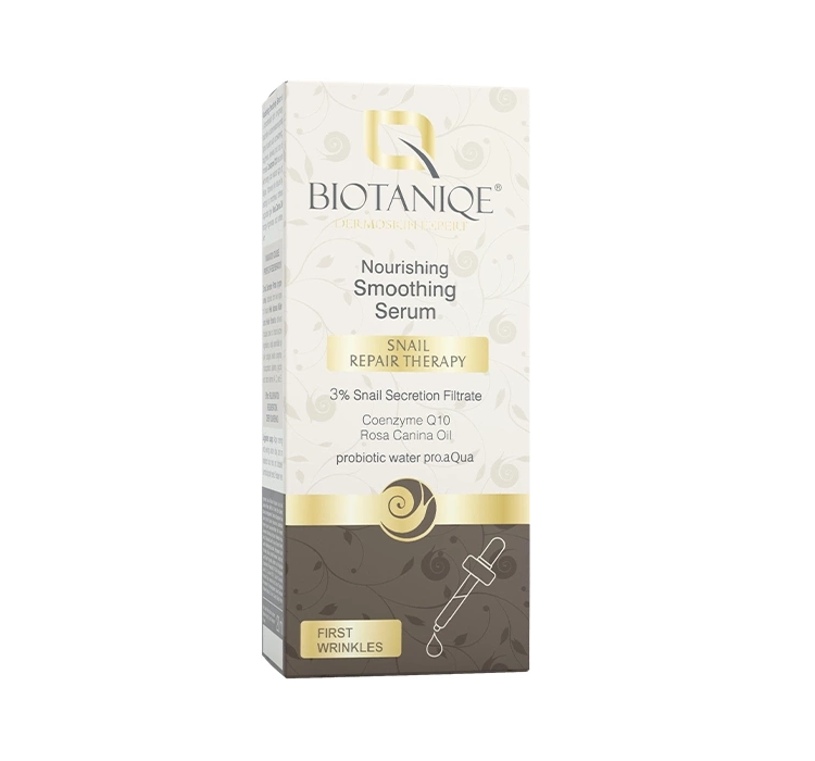 Anti-Aging-Serum Biotanique Snail Repair Therapy ist eine wirksame Waffe gegen die Zeichen der Hautalterung. Die Formel, angereichert mit hochkonzentriertem Schneckenschleim-Extrakt, wirkt regenerierend und verleiht der Haut Glätte, Festigkeit und strahlenden Glanz. Das Serum bekämpft effektiv Probleme wie starke Trockenheit, Rauheit, Falten und Elastizitätsverlust der Haut.