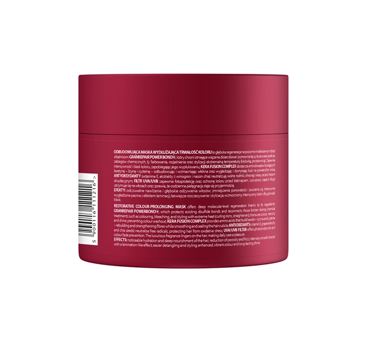 Ein weiterer wichtiger Komplex ist Kera Fusion Complex, der essentielle Aminosäuren – Lysin und Cystein – liefert, die für den Aufbau von Keratin benötigt werden. Diese Inhaltsstoffe reparieren und stärken das Haar von innen und glätten die Haaroberfläche, schließen die Schuppenschicht und reduzieren Frizz. Die Maske für coloriertes Haar ist zudem mit Antioxidantien wie Vitamin E, Trauben- und Chiasamenextrakt angereichert, die freie Radikale neutralisieren und das Haar vor oxidativem Stress schützen, der zu Haarschwächung und Farbverlust führen kann.