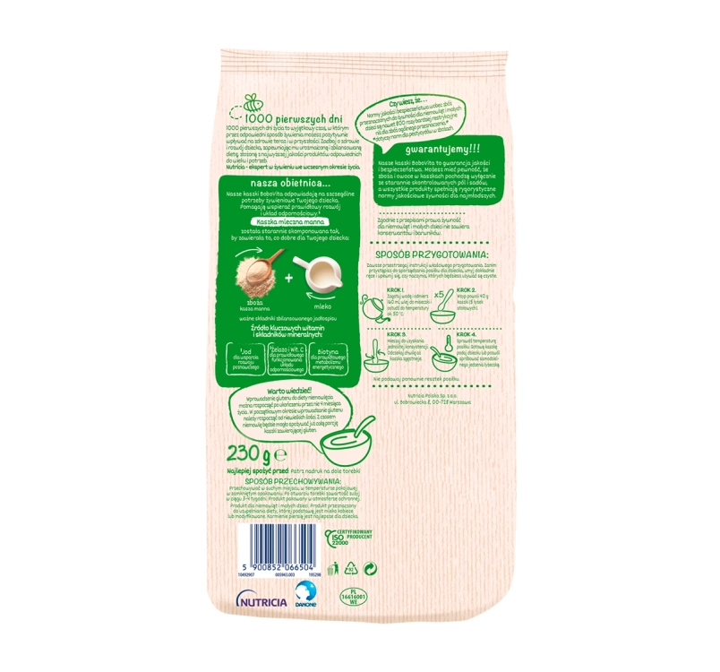 Der BoboVita Milchbrei Grieß wurde entwickelt, um dem Baby den glutenfreien Einstieg in die Ernährung in angemessenen Mengen zu erleichtern. Der Brei erfüllt strenge Qualitäts- und Sicherheitsstandards für Lebensmittel für die Kleinsten, und seine Zutaten stammen aus sorgfältig kontrollierten Feldern und Obstgärten.