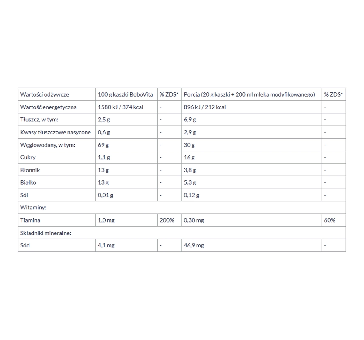 Der Vollkorn-Getreidebrei BoboVita ist eine Quelle für Vitamin B1 (Thiamin), das den Energiestoffwechsel unterstützt und für das Funktionieren des Nervensystems sowie des Herzens wichtig ist. Er enthält keinen Zuckerzusatz, keine Konservierungsstoffe, Farbstoffe oder Geschmacksverstärker – seine natürliche Süße stammt ausschließlich aus den Getreiden.