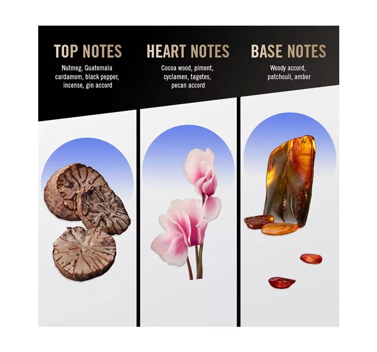 Die Kopfnote besticht durch würzigen Kardamom, kombiniert mit Gin und weiteren Gewürzen. Im Herzen entfalten sich dunkles Kakao, Alpenveilchen und die exotische Studentenblume, während die Basisnote aus Patchouli und warmem Amber besteht.