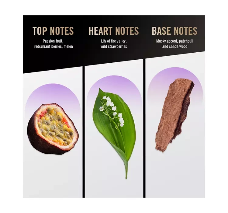 - Kopfnote: rote Früchte, Veilchen, Melone, Passionsblume