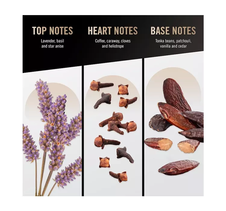 Der Duft beginnt mit subtilem Lavendel, kombiniert mit Basilikum und Sternanis. Das Herz bildet aromatischer Kaffee, Heliotrop, würzige Nelken und markanter Kümmel. Die Basis besteht aus Tonkabohne, Patchouli, süßer Vanille und warmem Zedernholz. Dieser Duft unterstreicht deine Stärken und deine Persönlichkeit. Die Komposition voller ausgewogener Noten wurde für selbstbewusste Männer kreiert, die das Leben genießen und keine Herausforderungen scheuen. Dieser ausgesprochen männliche Duft sorgt dafür, dass du voller Energie und Lebensfreude bist und dich von der Masse abhebst – keine Frau wird deinem Charme widerstehen können.