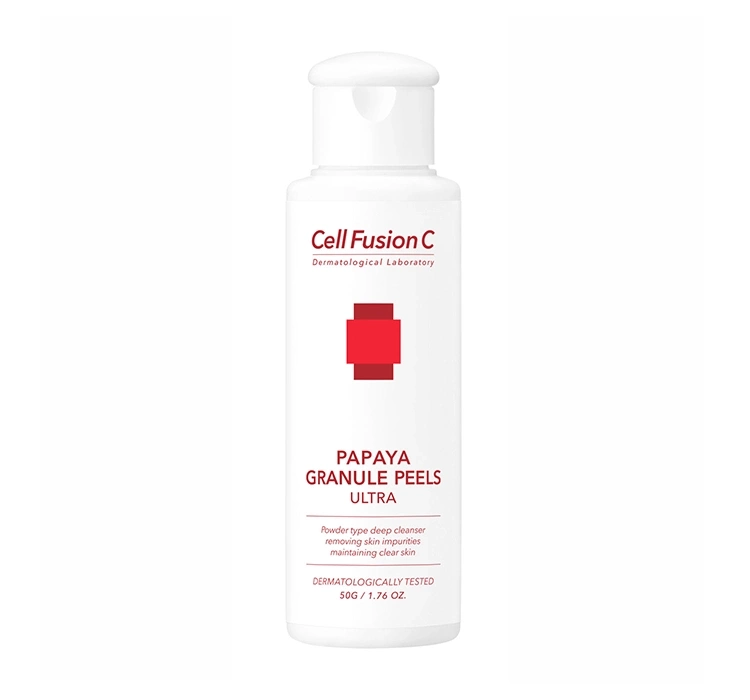 Trockenes Peeling für das Gesicht Cell Fusion C Papaya Granule Peels Ultra ist ein innovatives Kosmetikprodukt mit effektiver Wirkung, das in einer modernen Formel angeboten wird. Dieses enzymatische Peeling in Pulverform ist für alle Hauttypen geeignet, einschließlich empfindlicher Haut. Seine Rezeptur sorgt für eine tiefenwirksame Reinigung der Haut ohne das Risiko von Irritationen. Dank des Inhalts von Papaya-Extrakt, Vitamin C und Mineralien entfernt es sanft abgestorbene Hautzellen, glättet und befeuchtet die Haut, verbessert deren Textur und Teint. Das Peeling reguliert die Talgproduktion und erhöht die Festigkeit und Elastizität der Haut.