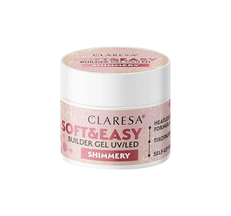 Aufbaugel Claresa Soft&Easy Shimmery ist ein natürlicher, zarter Nude-Ton mit feinen goldenen Schimmerpartikeln, der den Nägeln ein elegantes, glänzendes Finish verleiht. Es eignet sich perfekt sowohl für eine dezente Solo-Maniküre als auch als Basis für aufwendigere Nageldesigns. Dank der hohen Deckkraft – bis zu 90 % – sorgt es für ein glattes, ebenmäßiges und langlebiges Ergebnis.