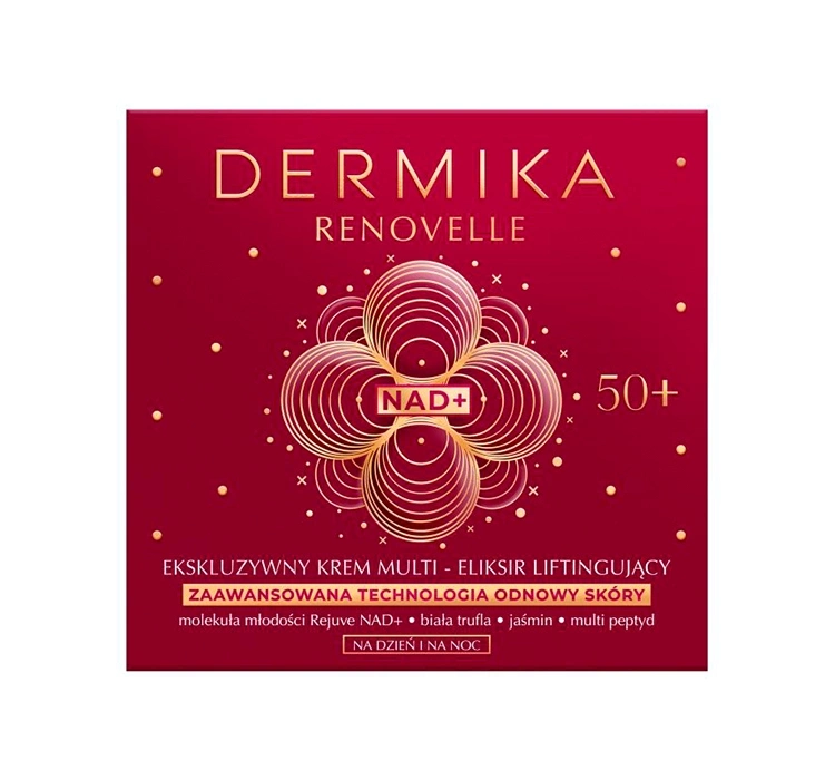 Exklusive Creme – Multi-Elixier Lifting 50+ Dermika Renovelle ist ein luxuriöses Produkt für Tag und Nacht, entwickelt für reife Haut, die Festigkeit, Spannkraft und Strahlkraft zurückgewinnen möchte. Sie richtet sich an Personen über 50, bei denen erste Anzeichen der Hautalterung sichtbar werden: Elastizitätsverlust, Falten, Hauterschlaffung und abgeschwächte Gesichtskonturen. Die Creme wirkt gleichzeitig als nährendes Elixier und Schutz – sie passt sich den Bedürfnissen der Haut tagsüber und während der nächtlichen Regeneration an. Die reichhaltige, samtige Textur umhüllt die Haut und bietet Komfort bei der Anwendung, für ein tägliches luxuriöses Pflegeerlebnis.