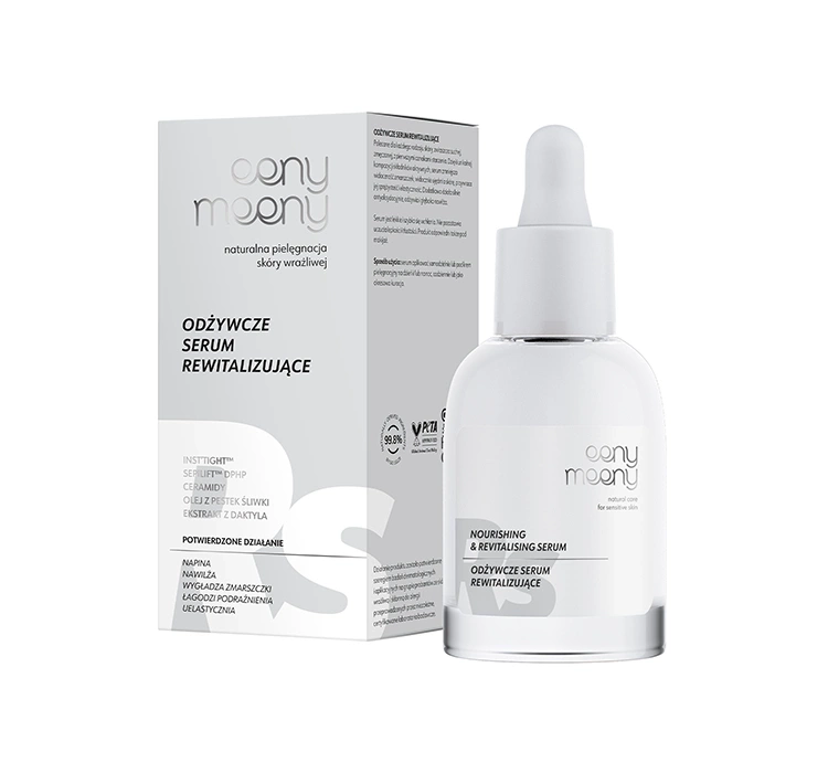 Die natürliche Formel von eeny meeny Nourishing & Revitalising Serum enthält eine durchdachte Komposition von Wirkstoffen mit Anti-Aging-Effekt. Sie schützen die Haut wirksam vor freien Radikalen und verleihen ihr jugendliche Ausstrahlung und Elastizität. Einige von ihnen sind erwähnenswert, wie INST'TIGHT™ Trigonella-Samen-Extrakt, PLANTID™ DACTYL EXTRACT, Pflaumenkernöl, die im Kollagen enthaltene Aminosäure SEPILIFT™ DPHP, das aktive Ceramid CERAFLUID, niedermolekulares hydrolysiertes Natriumhyaluronat und pflanzliches Squalan. Das Beste, was die Natur zu bieten hat.