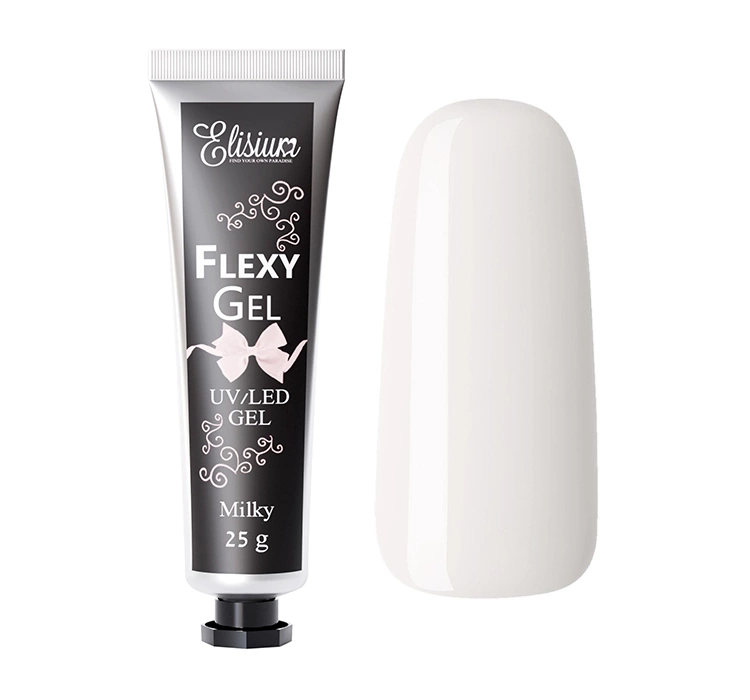 Elisium Flexy Gel ist ein Nagelgel, das Mithilfe einer LED/UV Lampe gehärtet wird. Dank ihm sicherst Du Deine Nägel vor Brüchen, verlängerst sie und härtest deren Oberfläche. Das Gel ist eine perfekte Basis für eine weitere Stiliserung sowohl mit einem Hybrid- oder klassischen Lack. Das Flexy Gel vereinigt Eigenschaften eines Gels und Acryls. Dank der innovativen Formel werden Deine Nägel widerstandsfähiger und stärker sein. Das Gel härtet erst unter einer UV/LED Lampe, dank dem kannst Du die Nägel ohne Eile stilisieren. Ein zusätzlicher Vorteil ist der Mangel von unangenehmen Geruch.