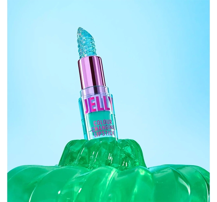 - gelartige, glänzende Textur – ein türkisfarbener Jelly-Lippenstift mit funkelndem Glitzereffekt
