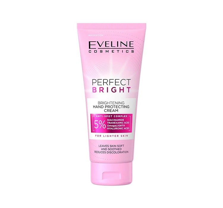 Die aufhellende schützende Handcreme Eveline Perfect Bright ist eine spezialisierte Pflege für die Haut der Hände, die feuchtigkeitsspendende, schützende und aufhellende Eigenschaften vereint. Sie ist besonders für Personen mit trockener, matter Haut und sichtbaren Pigmentflecken geeignet. Die Creme wirkt vielfältig – sie beruhigt, glättet und beugt Anzeichen der Hautalterung sowie schädlichen äußeren Einflüssen vor. Bereits nach der ersten Anwendung wird die Haut weicher und elastischer.