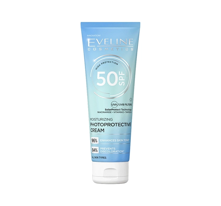 Feuchtigkeitsspendende Creme mit SPF50 Eveline ist ein unverzichtbares Element der täglichen Pflege, das fortschrittlichen Sonnenschutz mit intensiver Feuchtigkeit verbindet. Dank der innovativen Solar Protect-Technologie bildet die Creme auf der Hautoberfläche einen leichten, unsichtbaren Schutzschild, der wirksam vor schädlicher UVA- und UVB-Strahlung schützt. Die Wirkung der lichtschützenden Creme von Eveline zielt darauf ab, den Folgen der Hautalterung durch Sonnenstrahlung vorzubeugen, wie z. B. dem Verlust der Hautfestigkeit, Pigmentflecken oder der Entstehung von Falten. Es ist eine umfassende Lösung für alle, die ihre Haut schützen und gleichzeitig optimal pflegen möchten.