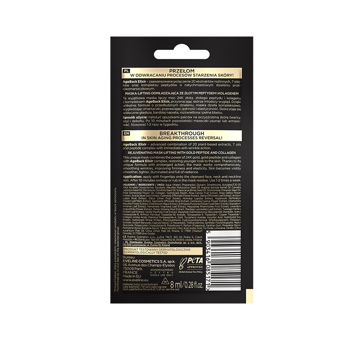 • Eveline Gold Peptides ist eine Maske, die die Kraft des Goldpeptids, Kollagens und des AgeBack Elixir-Komplexes vereint. Sie glättet die Haut intensiv, verbessert ihre Spannung, Elastizität und Festigkeit.