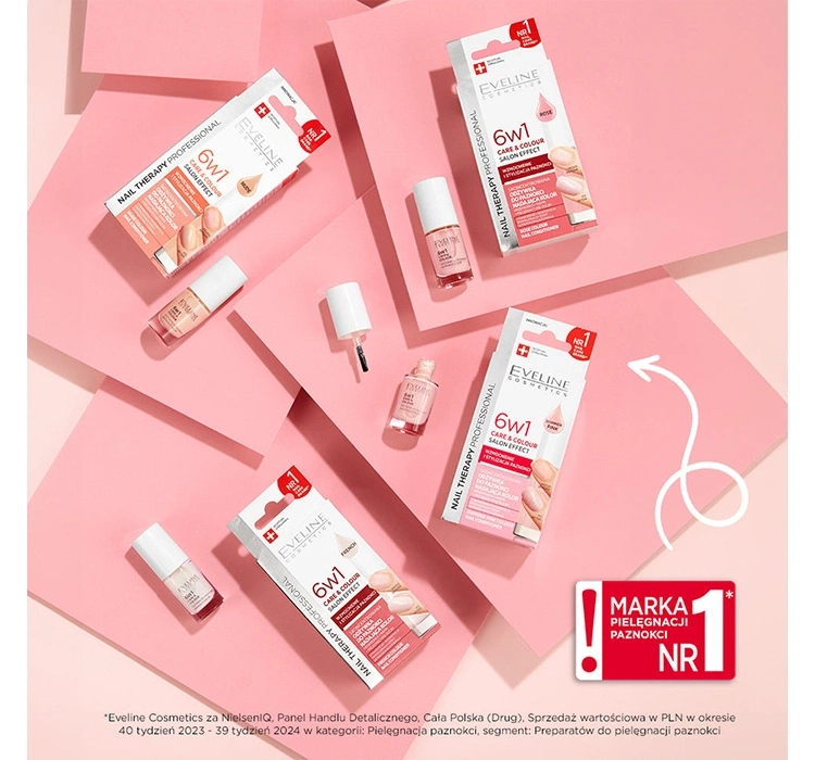 Eveline Nail Therapy Professional 6in1 Care & Colour Salon Effect ist ein konzentrierter Nagelpflege- und Farbpflege-Komplex, der nicht nur umfassende Pflege bietet, sondern den Nägeln auch eine zarte Farbe verleiht. Dank der revolutionären und einzigartigen Formel mit dem aktiven Colour & Double Strong-Komplex dringt die Pflege tief in die Nagelplatte ein, schützt wirksam vor mechanischen Schäden, Abrieb und Absplitterungen. Der Gehalt an Kieselsäure, pflegenden Ölen und weiteren aktiven Inhaltsstoffen stärkt und nährt die schwache Nagelplatte.