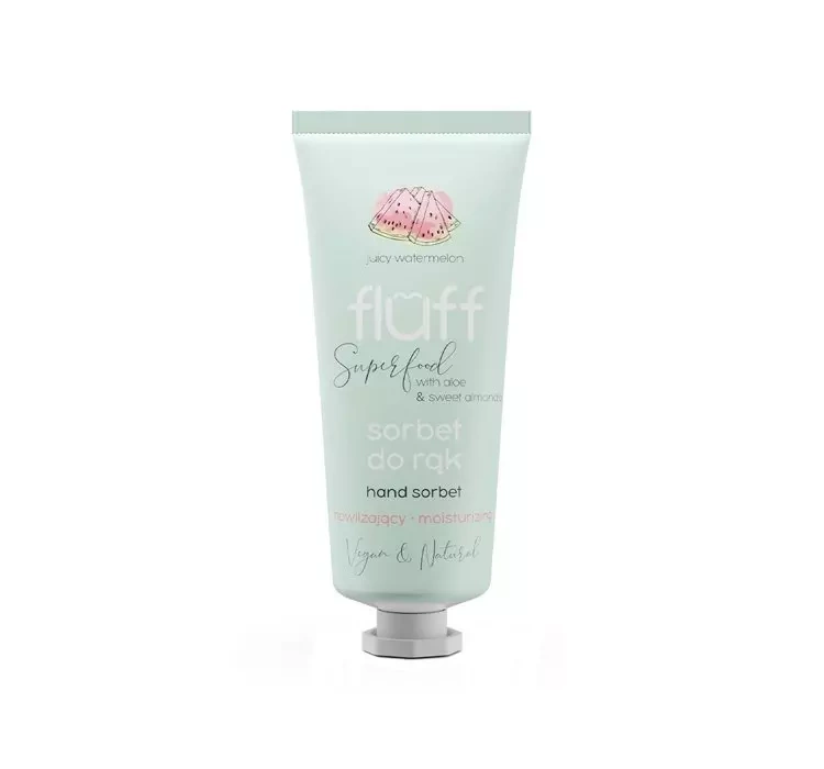 Fluff Hand Sorbet ist feuchtigkeitsspendende Handcreme mit leichter Gelkonsistenz und Duft von sanfter Wassermelone. Das Sorbet enthält Aloesaft, der wegen seiner feuchtigkeitsspendenden und lindernden Eigenschaften bekannt ist. Beugt der Handtrockenheit vor, macht die Haut weich und glatt. Lindert Reizungen, beschleunigt Heilung der Verletzungen. Verleiht den trockenen Händen Gefühl von Erleichterung und Komfort. Öl aus süßen Mandeln kommt perfekt mit rauer und gespannter Haut zurecht, wirkt feuchtigkeitsspendend und anti-ageing. Die Haut bekommt den verlorenen Glanz wieder.
