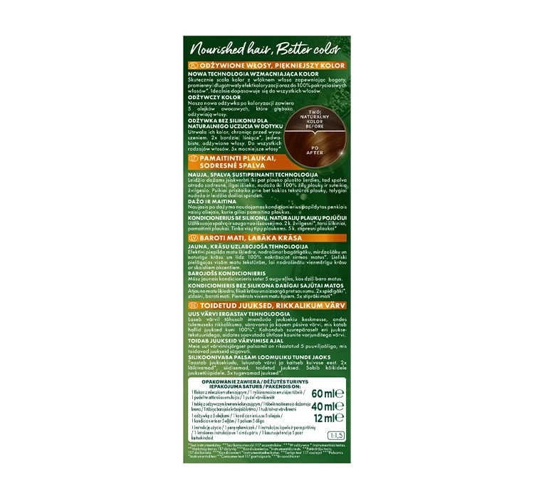 Garnier Color Naturals Crème ist eine umfangreiche Palette von Haarfarben mit einer pflegenden Formel, die mit fünf Ölen angereichert ist. Dank dieser Inhaltsstoffe pflegt die Haarfarbe das Haar während des Färbevorgangs und hinterlässt es glänzend und gesund.