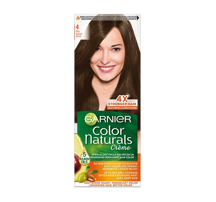 Garnier Color Naturals Crème ist eine umfangreiche Palette von Haarfarben mit einer pflegenden Formel, die mit fünf Ölen angereichert ist. Dank dieser Inhaltsstoffe pflegt die Haarfarbe das Haar während des Färbevorgangs und hinterlässt es glänzend und gesund.