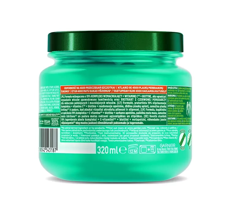 Die Haarmaske Garnier Fructis GROW STRONG wurde angereichert mit Extrakt aus chinesischer Orange, Vitamin C sowie Biotin und einem 19% stärkenden Komplex. Diese Inhaltsstoffe revitalisieren, regenerieren und pflegen die Haare, verbessern ihren Zustand und reduzieren ihre Brüchigkeit. Ein weiterer Vorteil des Produkts ist sein schöner Duft, der seine Anwendung angenehm macht.