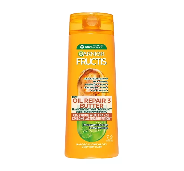 Das stärkende Shampoo Fructis Oil Repair 3 Butter macht Ihr Haar stärker, weicher und strahlend auf der ganzen Länge.