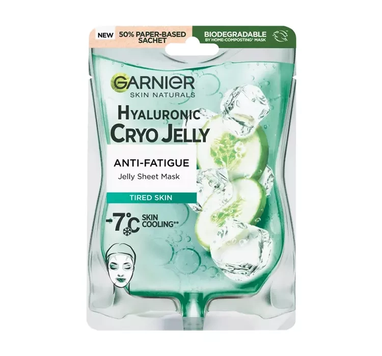 Die Gesichtsmaske aus der Garnier Hyaluronic Cryo Jelly-Reihe enthält in ihrer pflegenden Formel Gurkenextrakt und Hyaluronsäure. Gurke strafft und glättet die Haut effektiv, während Hyaluronsäure ihr Feuchtigkeit und Fülle verleiht. Sofort nach der Anwendung der Maske erhält die Haut ein frisches und ausgeruhtes Aussehen, und bei regelmäßiger Anwendung wird die Haut fester und besser hydratisiert.