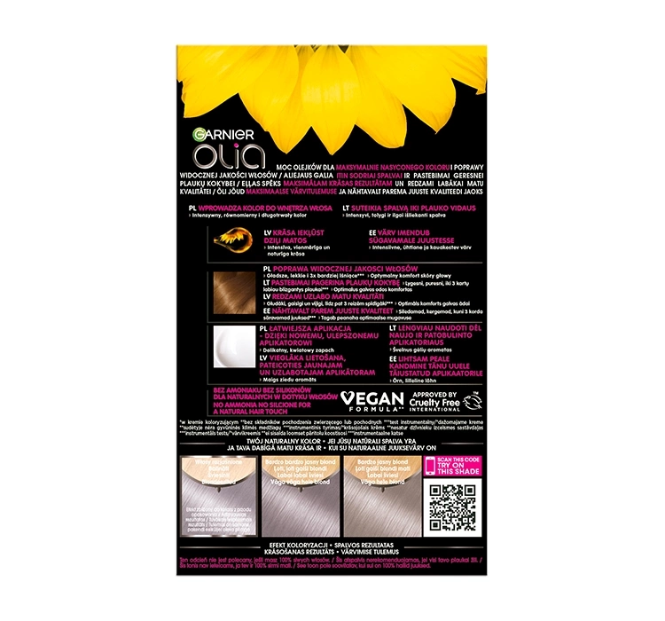 Garnier Olia ist eine komplette Palette permanenter Haarfärbemittel. Die einzigartige Formel der Farben enthält bis zu 60% natürliche Blütenöle, die das Eindringen der Farbe erleichtern und einen satten, lebendigen Farbton garantieren.