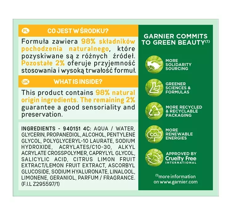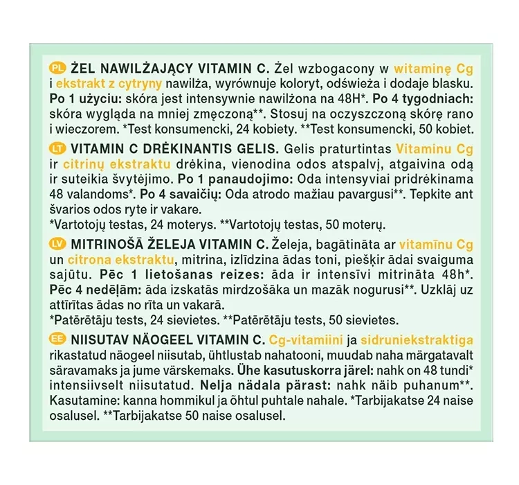 Die innovative Formel des Feuchtigkeitsgels Vitamin C Glow Jelly von Garnier wurde angereichert mit:Vitamin Cg – ein Wirkstoff, der für seine aufhellenden, straffenden und verjüngenden Eigenschaften bekannt ist, Zitronenextrakt - mit natürlichen Peeling-Eigenschaften, beseitigt Verfärbungen, die durch übermäßige Sonneneinstrahlung oder Akne verursacht werden.