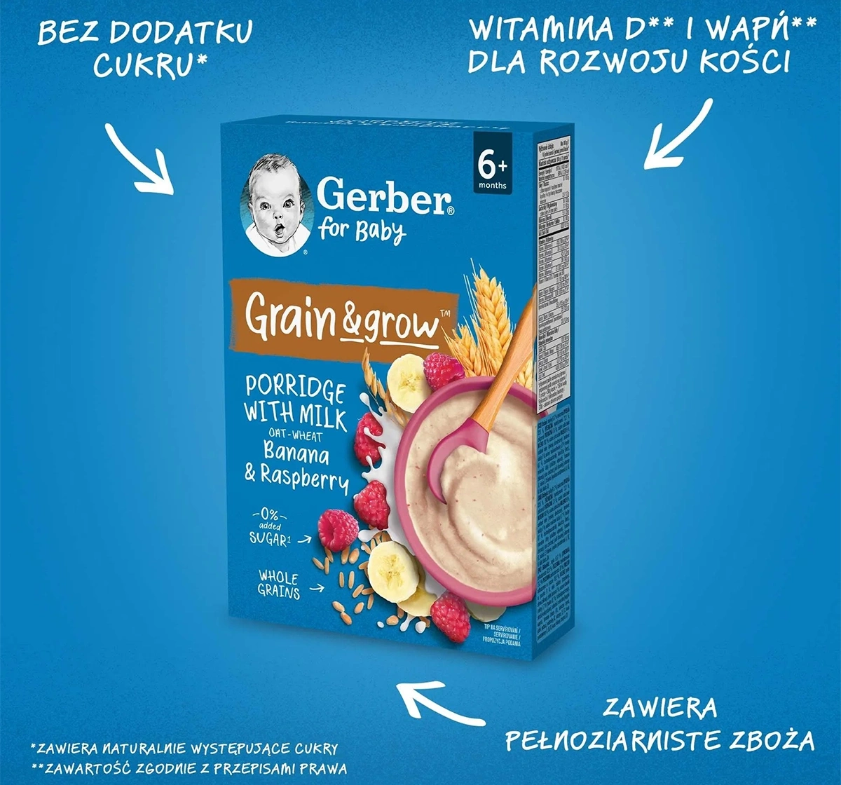 Gerber Grain & Grow Milch-Getreidebrei Banane Himbeere ist eine vollwertige und köstliche Mahlzeit für Säuglinge ab dem 6. Lebensmonat. Er enthält hochwertiges Vollkorngetreide – Hafer und Weizen – angereichert mit süßen Bananen und saftigen Himbeeren, wodurch er den Speiseplan des Babys bereichert und hilft, neue Geschmacksrichtungen einzuführen.