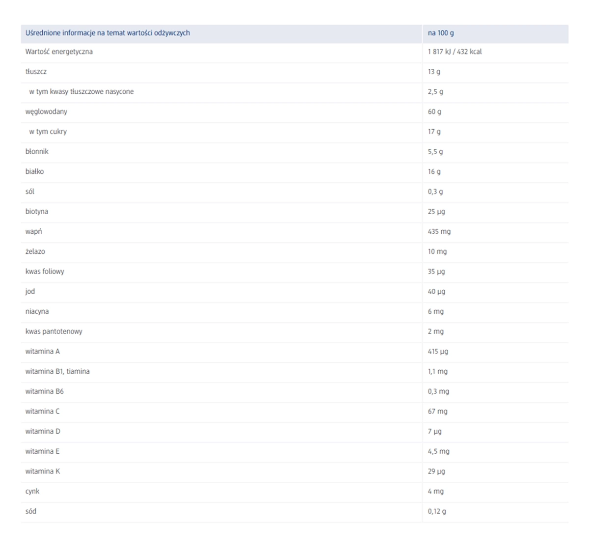 Ingredients: Mehl 61,7 % (Vollkorn-Hafermehl 32,9 %, hydrolysiertes Weizenmehl 21,2 %, Vollkorn-Weizenmehl 7,6 %), Magermilchpulver 19,2 %, Vollmilchpulver 9 %, pflanzliche Öle (Rapsöl, Sonnenblumenöl), Bananenflocken 3 %, gefriergetrocknete Himbeerstücke 1,7 % (Himbeere 0,7 %, Fructooligosaccharide, Maisstärke), Kalzium (Calciumcarbonat), Eisen (Eisen(II)-fumarat), Zink (Zinksulfat), Jod (Kaliumjodid); Vitamine: C, Niacin, E, Thiamin (B1), Pantothensäure, A, B6, K, Folsäure, Biotin, D.