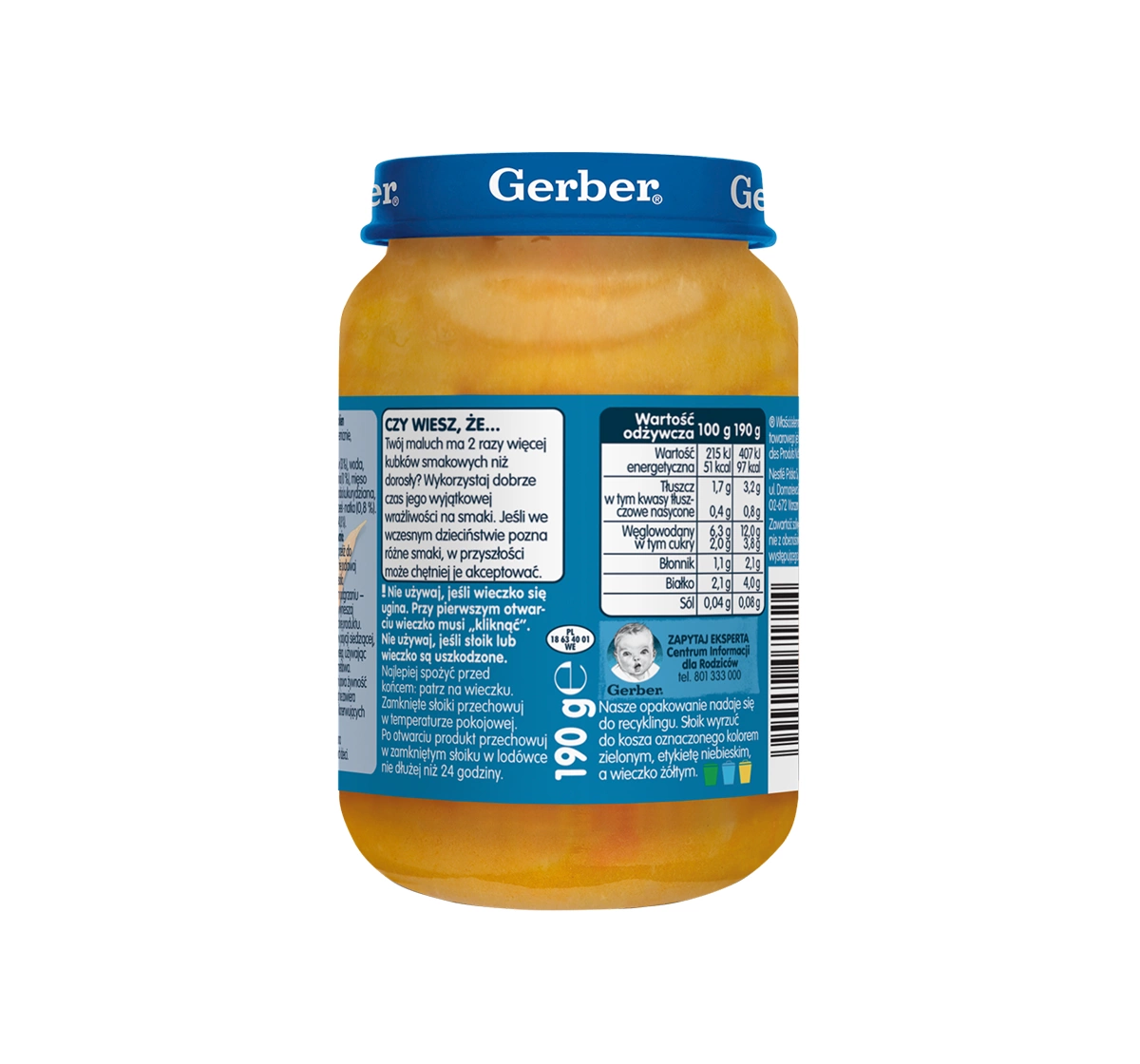 Das Mittagsgericht im Gläschen nach dem 6. Monat von Gerber enthält keine Konservierungsstoffe oder Farbstoffe – gemäß den gesetzlichen Vorschriften. Es muss vor dem Öffnen nicht im Kühlschrank aufbewahrt werden, was es zu einer praktischen Lösung für zu Hause und unterwegs macht. Eine gute Wahl für Eltern, die ihrem Kind täglich eine abwechslungsreiche, sichere und ausgewogene Mahlzeit bieten möchten.