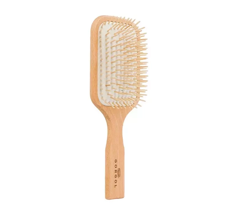 Die Gorgol Haarbürste wurde mit einem pneumatischen Kissen aus flexiblem und extrem strapazierfähigem Gummi ausgestattet. Das Kissen hat ein Loch, das eine ordnungsgemäße Luftbewegung und einen ordnungsgemäßen Betrieb der Bürste gewährleistet. Darüber hinaus verwendet die Bürste hochwertige Holznadeln. Sie sind äußerst sanft zur Kopfhaut und sorgen für eine angenehme Kopfhautmassage. Das Produkt ist hochtemperaturbeständig und kann in Verbindung mit einem Trockner verwendet werden.