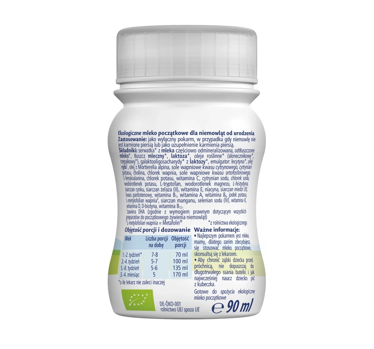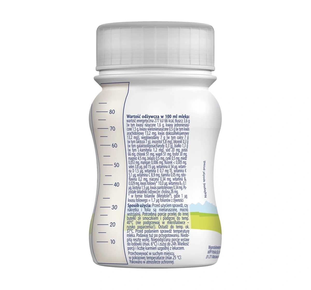Zubereitung: Vor Gebrauch sicherstellen, dass der Verschluss und die Folie unversehrt sind. Die Flasche gut schütteln und die benötigte Menge in eine sterile Flasche mit Sauger umfüllen. Die Milch auf 40 °C erwärmen (keine Mikrowelle verwenden, um Verbrühungsgefahr zu vermeiden). Anschließend auf ca. 37 °C abkühlen lassen und vor dem Füttern die Temperatur prüfen. Die Milch sofort nach der Zubereitung verfüttern und nicht verbrauchte Reste entsorgen. Falls die Milch nicht erwärmt wurde, kann sie im Kühlschrank (max. 6 °C) aufbewahrt und innerhalb von 24 Stunden verbraucht werden. Besprechen Sie die Portionsgröße und die Anzahl der Mahlzeiten mit Ihrem Kinderarzt.