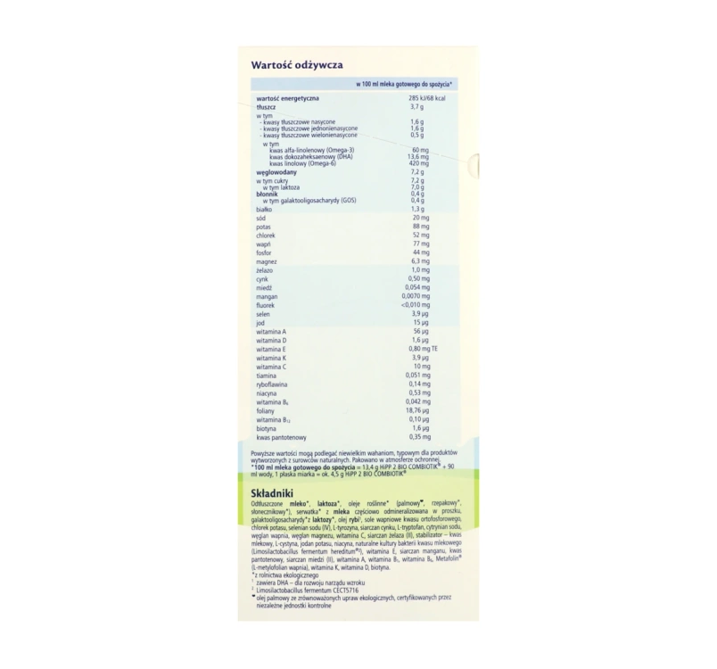 Inhaltsstoffe: Magermilch*, Laktose*, pflanzliche Öle* (Palm**, Raps*, Sonnenblumen*), Molkenpulver* aus teilentmineralisierter Milch, Galaktooligosaccharide* aus Laktose*, Fischöl¹, Calciumphosphate, Kaliumchlorid, Natriumselenat (IV), L-Tyrosin, Zinksulfat, L-Tryptophan, Natriumcitrat, Calciumcarbonat, Magnesiumcarbonat, Vitamin C, Eisen(II)-sulfat, L-Cystein, Kaliumjodid, Niacin, natürliche Milchsäurebakterienkulturen (Limosilactobacillus fermentum hereditum²), Vitamin E, Mangansulfat, Pantothensäure, Kupfersulfat (II), Vitamin A, Vitamin B₁, Vitamin B₆, L-Methylfolat-Calcium³, Vitamin K, Vitamin D, Biotin. *aus ökologischem Landbau, ¹ enthält DHA (gemäß gesetzlicher Vorschrift), ² Limosilactobacillus fermentum CECT5716, ³ L-Methylfolat-Calcium = Metafolin, **Palmöl aus nachhaltig zertifizierten ökologischen Anbauflächen.