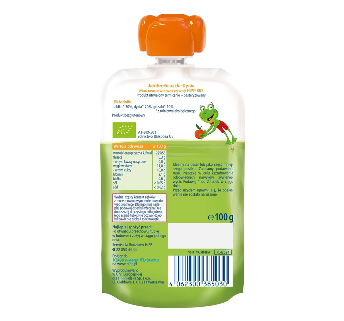 WARNHINWEISE: Zur Sicherheit: Vor dem Gebrauch prüfen, ob die Verpackung unbeschädigt ist. Das Kind nicht mit dem Beutel oder dem Deckel spielen lassen. Wichtig: Häufiger Kontakt der Zähne mit dem Püree kann Karies verursachen. Daher das Püree vorzugsweise mit dem Löffel füttern und längeres Saugen am Beutel vermeiden.