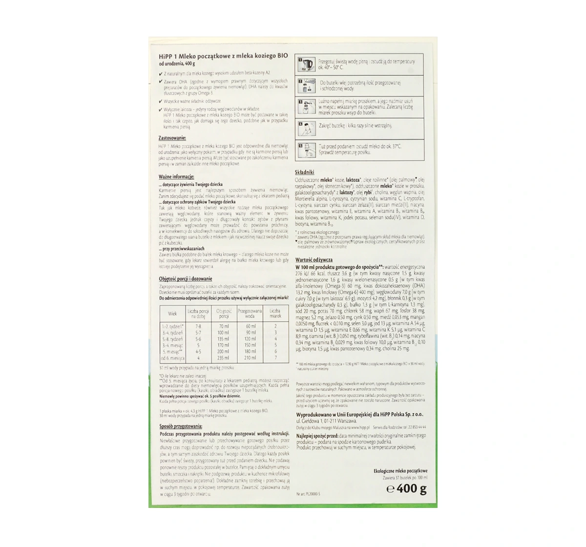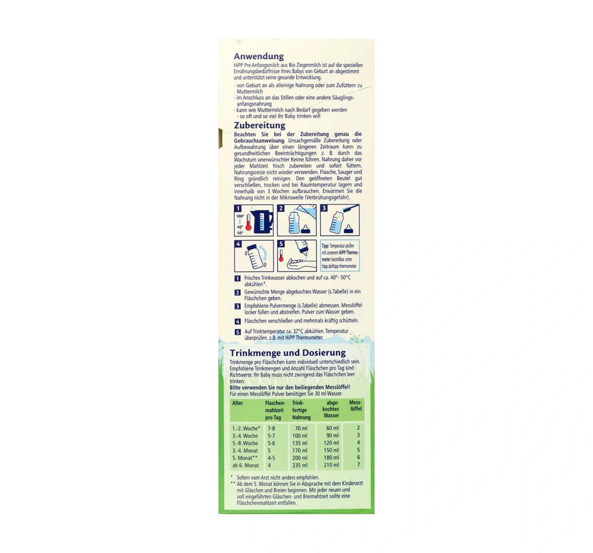 DeutschlandHiPP Bio Ziegenmilchnahrung 1 ist für Babys ab der Geburt geeignet, sowohl als alleinige Nahrung als auch zur Ergänzung des Stillens. Sie kann nach Beendigung des Stillens oder als Ersatz für eine andere Säuglingsnahrung verwendet werden.