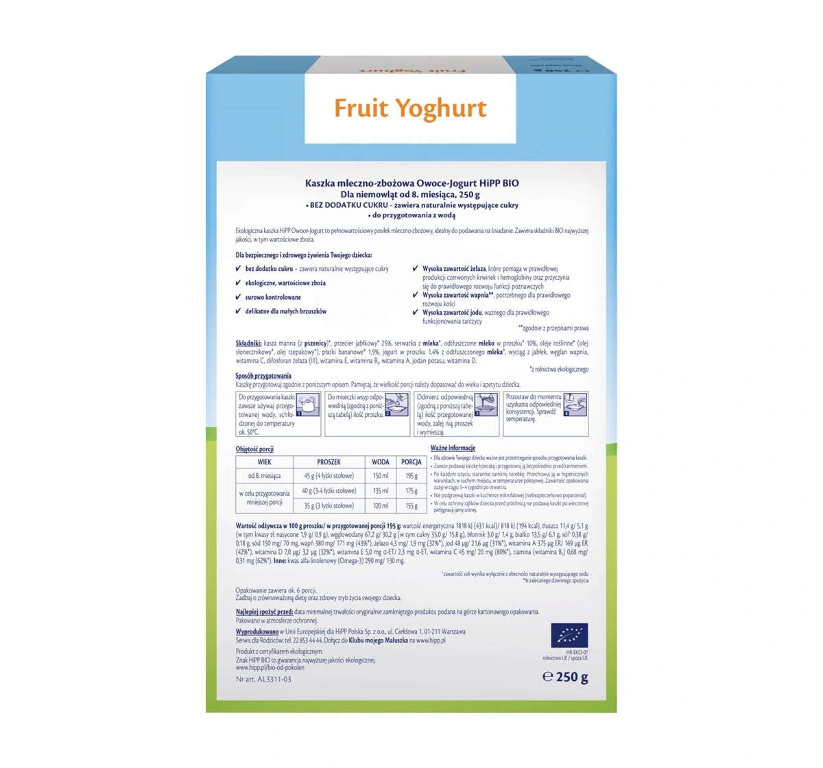 HiPP Organic Milk&Cereal Früchte Brei ist eine vollwertige Mahlzeit für Babys ab dem 8. Lebensmonat. Die sorgfältig entwickelte Rezeptur kombiniert zarte Getreidearten, Bio-Milch und natürliche Früchte, um ein leckeres Gericht zu kreieren, das Energie und Nährstoffe liefert, die für das gesunde Wachstum Ihres Babys notwendig sind. Es ist die ideale Wahl für Frühstück, Abendessen oder einen Snack.