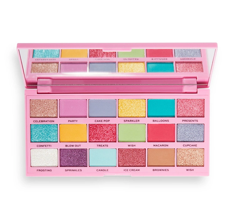 Die I Heart Revolution Tasty Birthday Cake Lidschattenpalette enthält 18 Lidschatten und ist mit einem interessanten Geburtstagskuchen-Motiv gestaltet.