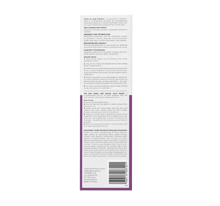 Die professionelle Reibe von L'biotica ist ein äußerst wirksames Produkt, das mühelos alle verhornten und abgestorbenen, harten Hautpartien an den Füßen entfernt. Er ist mit Minifeilen ausgestattet, die die Haut sofort glätten und weicher machen und für ein schönes, gesund gepflegtes Aussehen sorgen. Der leichte, ergonomische Griff liegt gut in der Hand und macht die Benutzung äußerst komfortabel und angenehm.