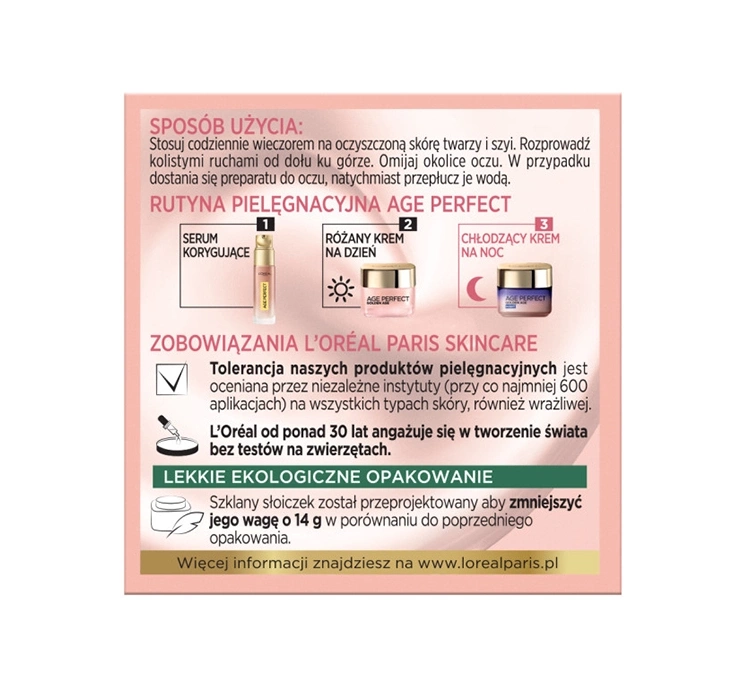 Die kühlende, festigende Nachtcreme L’Oréal Paris Age Perfect Golden Age ist eine intensiv regenerierende Pflege für reife Haut, die mit zunehmendem Alter an Festigkeit und Ausstrahlung verliert. Die Creme wurde speziell für die nächtliche Hauterneuerung entwickelt und wirkt genau dann, wenn die Haut es am meisten braucht – während des Schlafs. Schon bei der ersten Anwendung sorgt sie für ein Gefühl von Frische und Komfort, indem sie die Haut mit einem sanften, kühlenden Effekt umhüllt, der beruhigt und die Haut nach einem langen Tag erfrischt.
